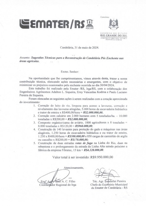 Um grupo técnico formado por diversas instituições como Emater, representada pelo Chefe do Escritório Local Sanderlei Pereira, Sindicato Rural representado pelo seu presidente José Emmel, Agrican, representada por Adalto Siqueira, o empresário de empresa de Terraplanagem e Engenheiro Agrônomo, Erny Kudrna (Kiko), Irga, e com apoio do Senador Luiz Carlos Heinze, e pessoas ligadas a Universidade Federal de Santa Maria, estiveram nesta segunda-feira, 03 pela manhã, em reunião com o prefeito Rim, o vice Cristiano Becker, o Coordenador de Enfrentamento de Crise, Flávio Karnopp, o secretário de Administração Jorge Mallmann, e o técnico Agrícola, Alex Wegner, para sensibilizar e buscar o apoio da municipalidade no amparo ambiental e jurídico, para iniciar um trabalho de correção e desassoreamento do Rio Pardo e também na propriedade dos agricultores, um trabalho público privado com recursos de fora para contratação de maquinas, com urgência para conseguir fazer a próxima safra de tabacos, já que as mudas estão prontas, e muitas lavouras estão ameaçadas e sem condições de plantio pelos estragos causados pelas enchentes dos Rios Pardo, Botucaraí e arroios, e caso não se faça essa correção, de forma urgente, acarretará num impacto negativo na próxima safra e consequentemente na economia do município.